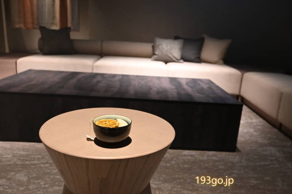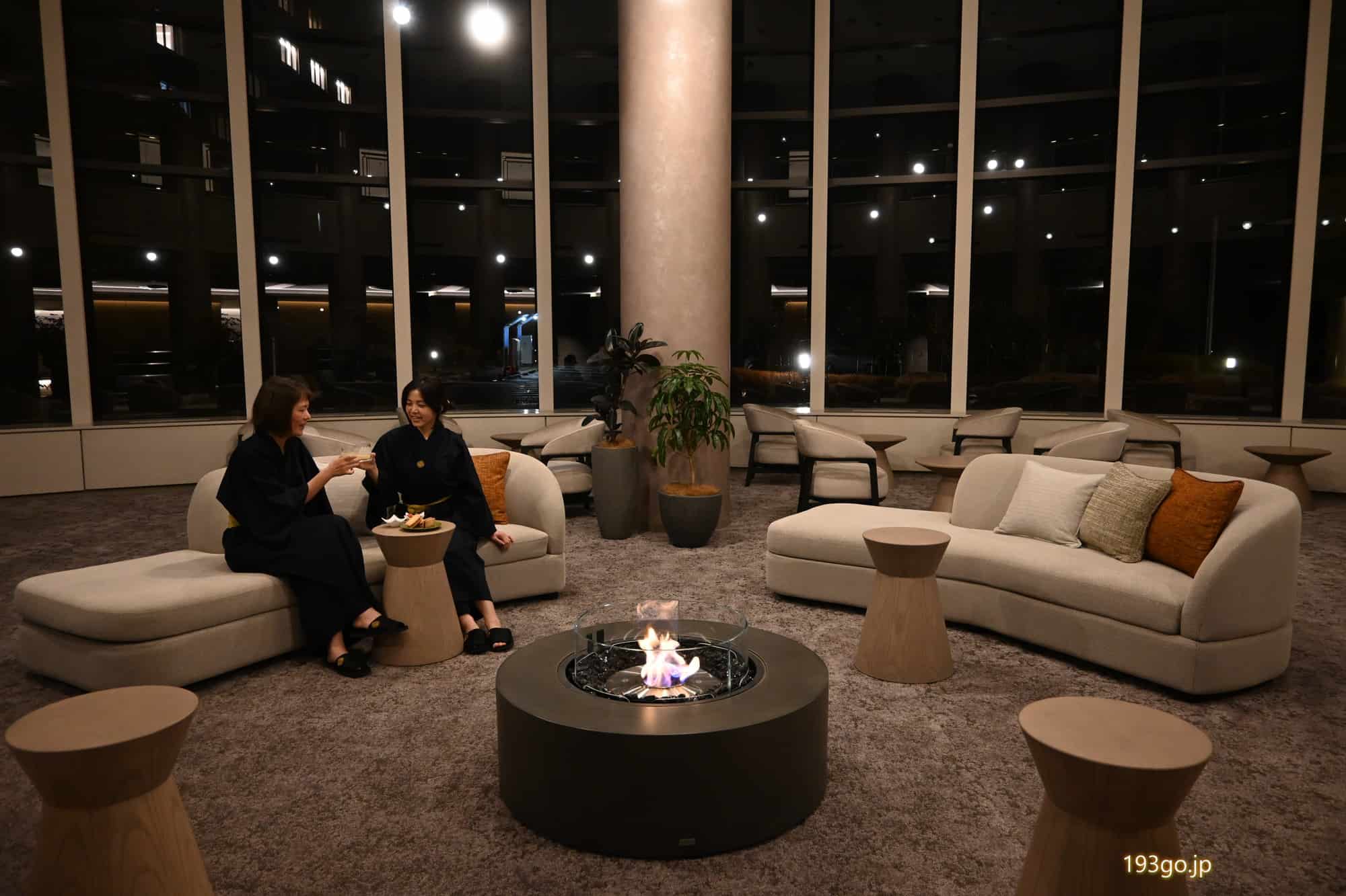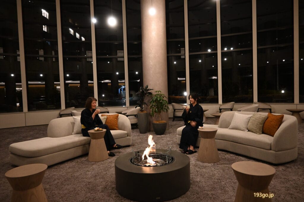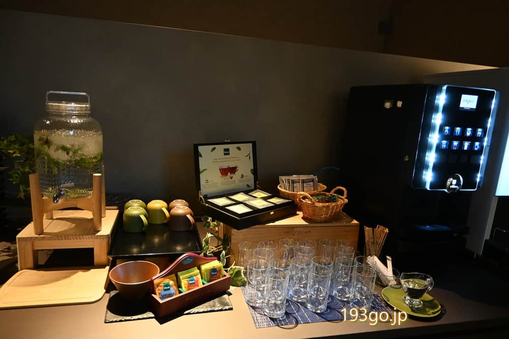 2階の大浴場があるフロアには広々した温泉ラウンジ(15:00~23:00)があり、爽やかなビネガードリンクや山梨の日本茶、夜には甘酒も提供。