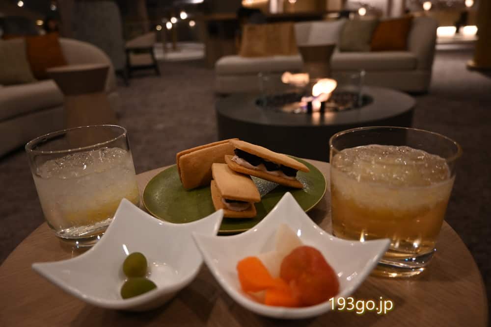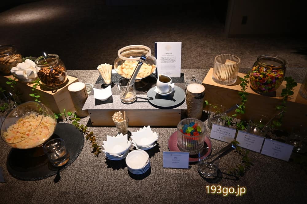 おつまみは、ラングドシャ、プレッツェル、マシュマロ、グミ、マーブルチョコなど甘いものが中心。