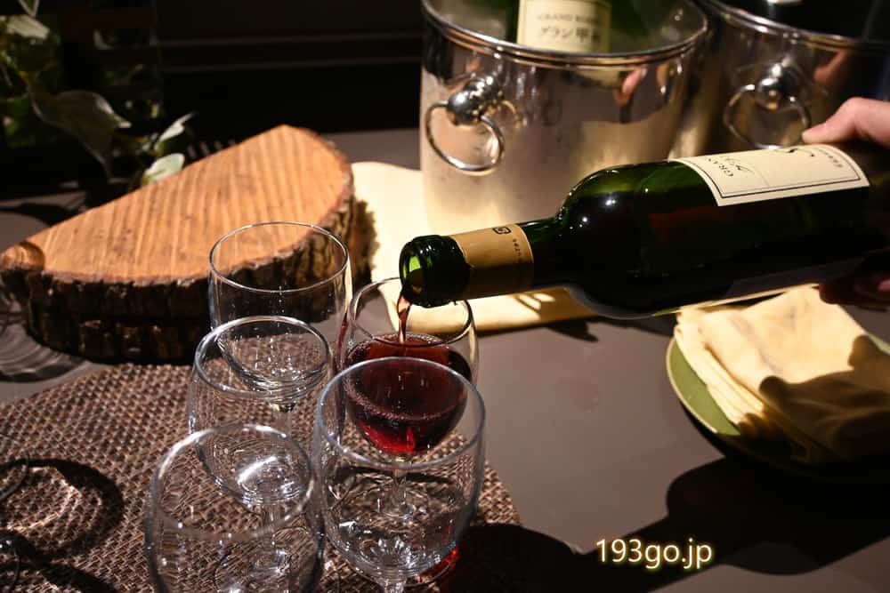 新漬けオリーブ、山梨県産野菜のピクルス、大粒レーズンのバターサンドなどのリッチなおつまみが楽しめた。