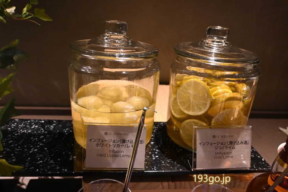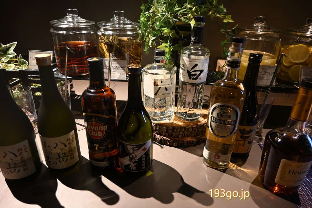 八ヶ岳の純米本格焼酎や、ジャパニーズクラフトウオツカ HAKU <白(ハク)>、クラフトジン ROKU〈六〉、各種ウイスキーなどの高級感のあるボトルが並び、レモンやライム、ハーブ&スパイスの漬け込み酒も。
