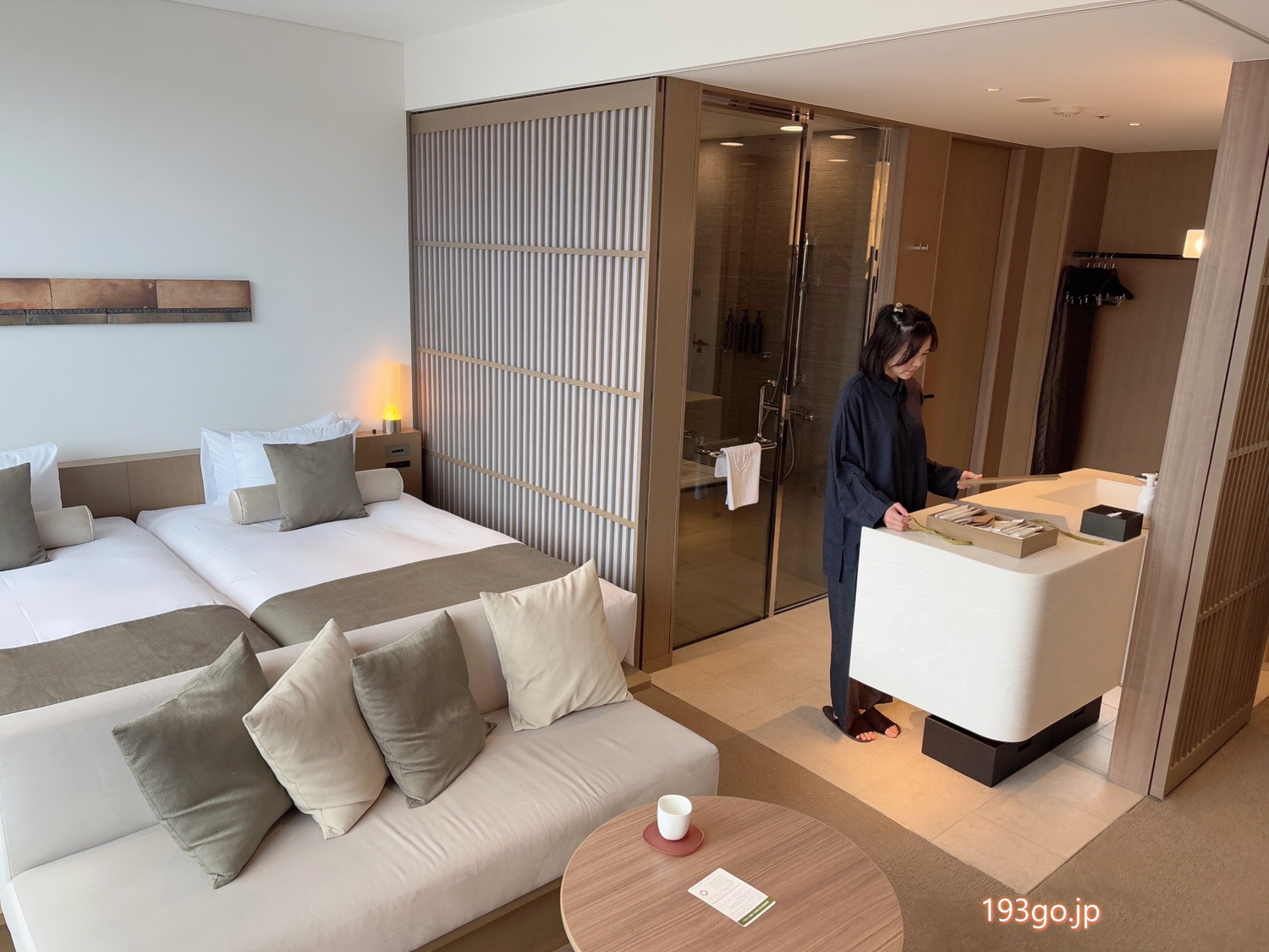 部屋の中央部に洗面台が備わり、ガラス扉のバスルームやオープンクローゼットが用いられ、広々としている。 障子戸をスライドすれば、ベッドルーム側と完全に仕切られるね。
