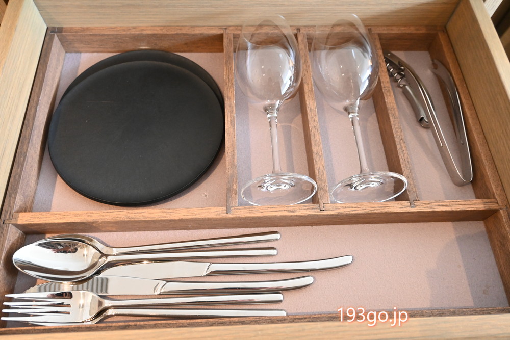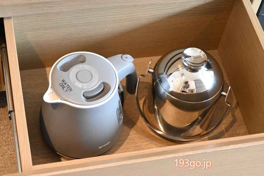 デスク周りに、コーヒーマシン、ミネラルウォーター、お茶セット、電子ケトル、カトラリーやグラス類などが一式揃う。テレビ台の下は収納スペースに。