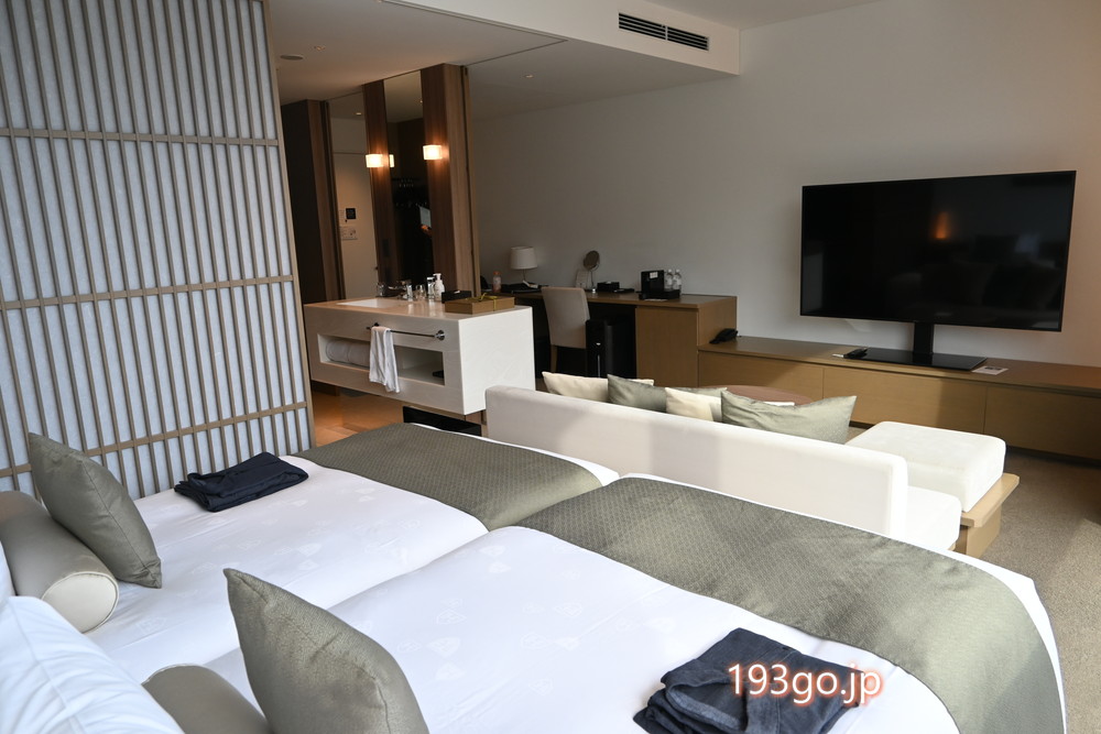お部屋の中は、白を基調にアースカラーや木材を取り入れた、ナチュラルで落ち着きのある和モダンなデザイン。ベッド二台にソファー、テレビ、デスクスペースも。