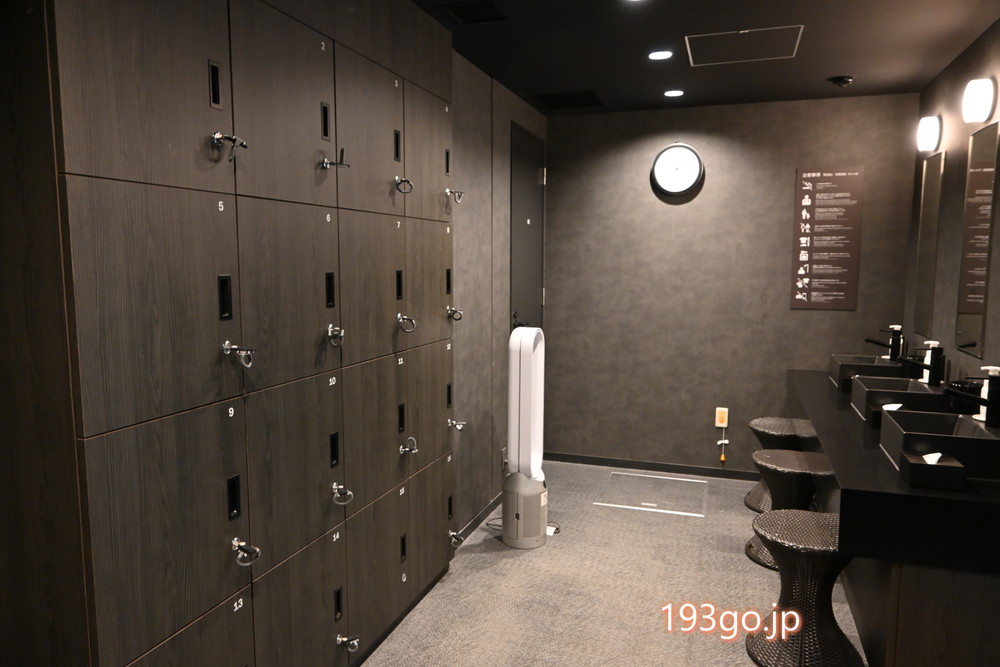 脱衣場には鍵付きロッカーと洗面台、ドライヤー、飲料水などが完備。