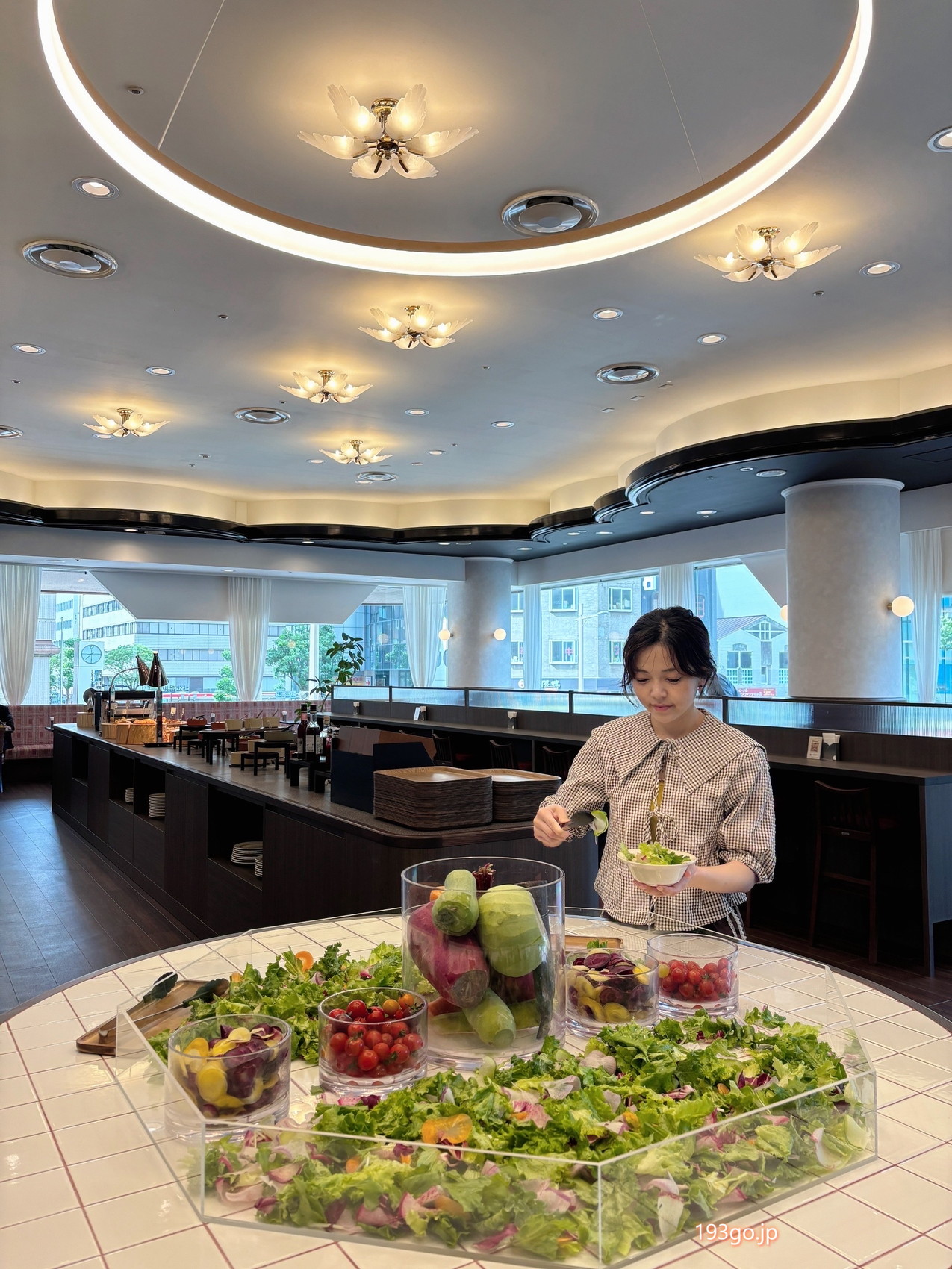 ブッフェ台はゆったりと配置され、料理が見やすく、落ち着いて選べるスタイル。