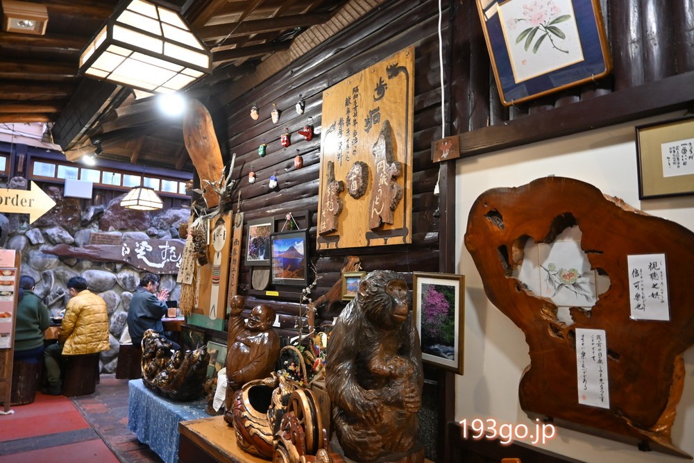 木彫りの骨董品が飾られた、風情のある建物。