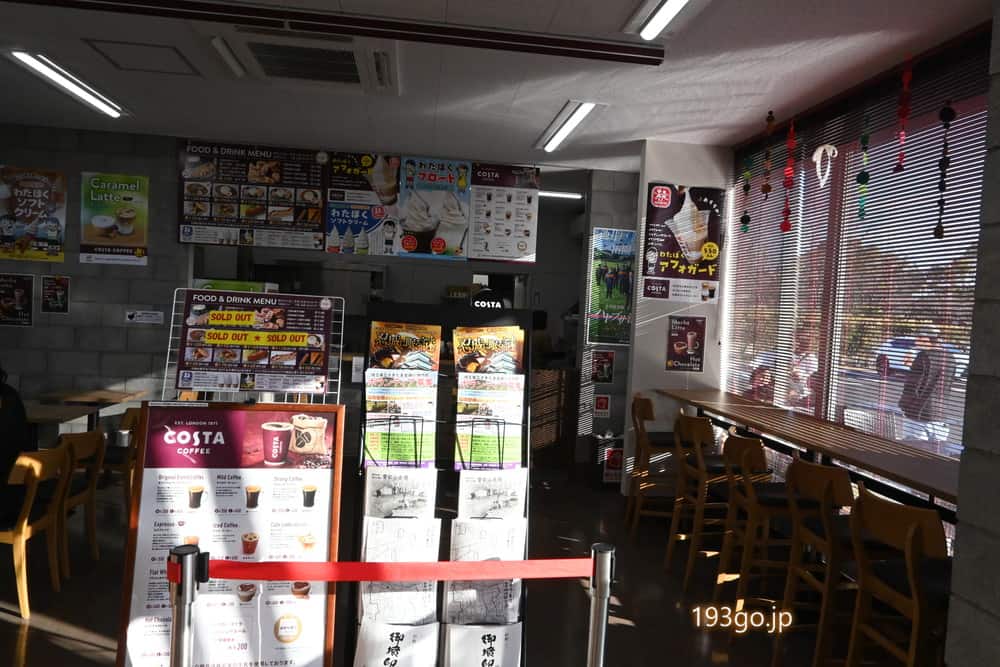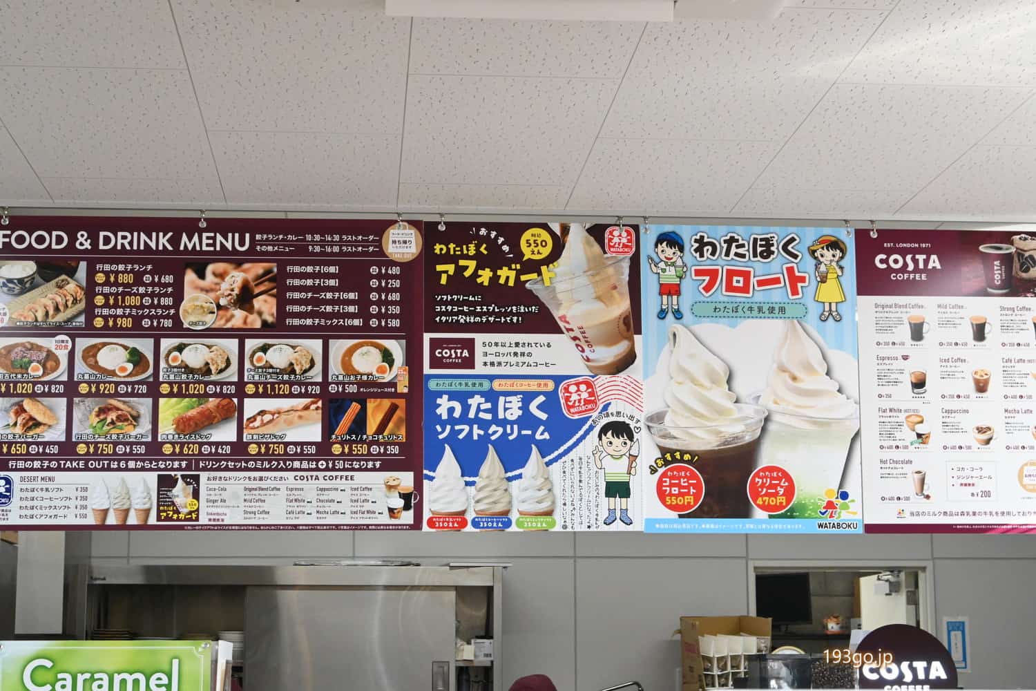 餃子やカレー、餃子バーガー、チュロス、ソフトクリーム、フロート、コスタコーヒーなど。