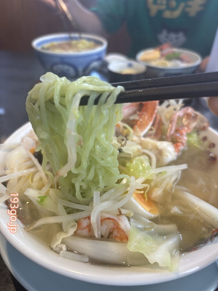 麺はクロレラ麺で緑がかってる。ツルモチっとしたちぢれ麺。