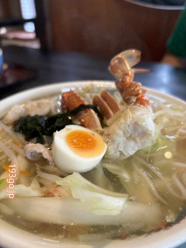 海鮮ラーメンには蟹、海老、ホタテ、イカ、アサリの他、もやしなどの野菜に豚肉、ワカメ、ゆで卵と豪華な具材でスープもナミナミ、盛りが良い!