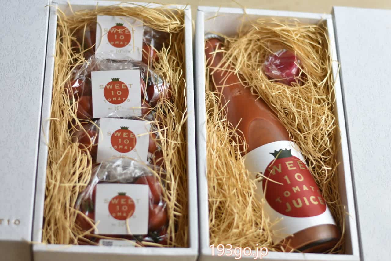 トマトの形をあしらった、真っ赤な箔がポイントの専用ボックス入り