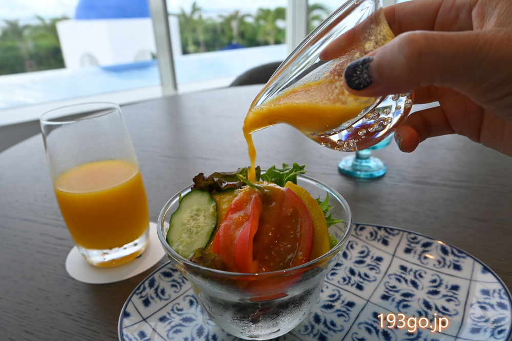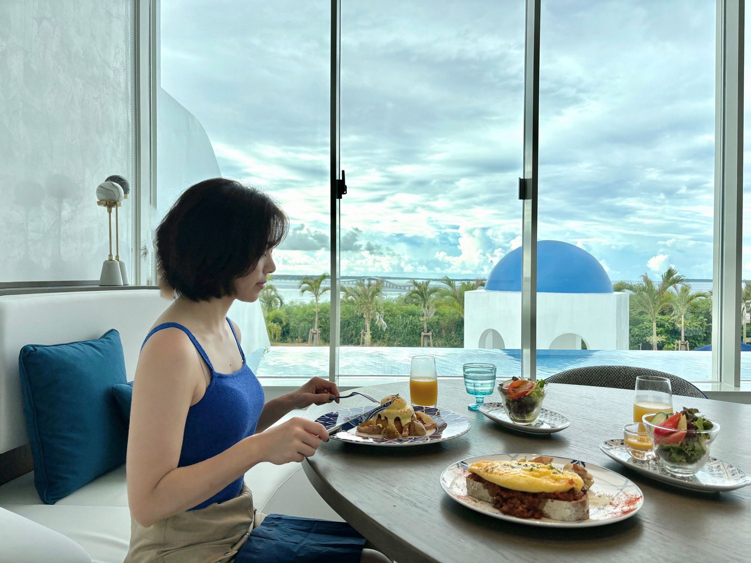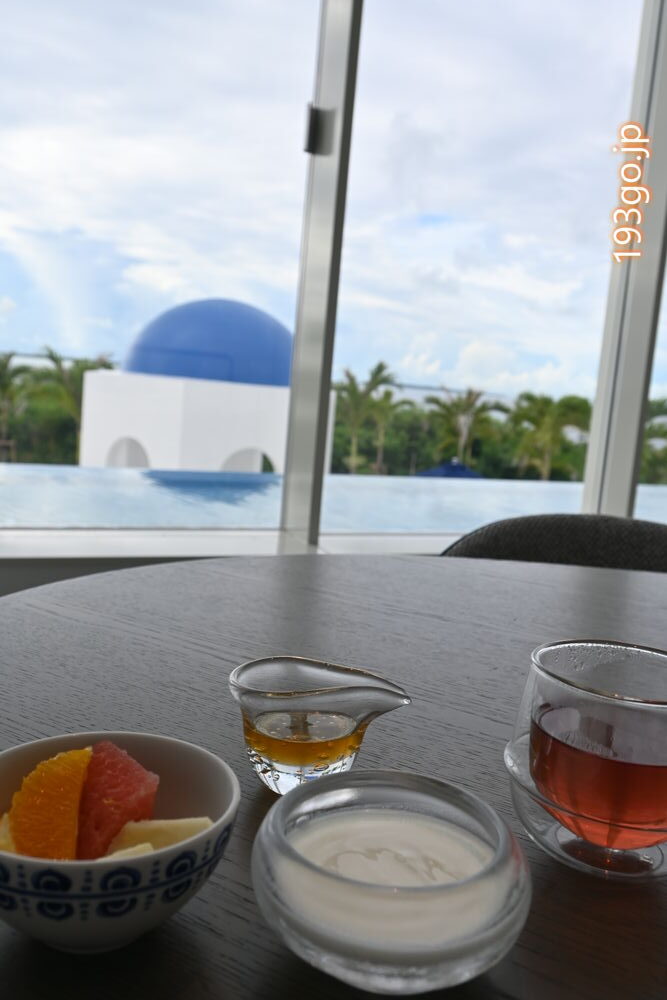 エントランスから、プール、お部屋、レストラン…、ホテル内の何処にいてもサントリーニ島を思わせる風景と過ごせる非日常空間。ラグジュアリーな朝食は思い出に。