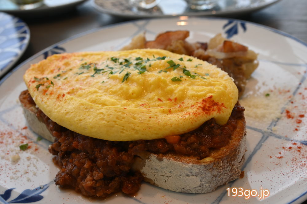 オープンサンドは、表面はバリっとしたもちもちのカンパーニュにフワトロの半熟オムレツが乗り、お肉の旨みたっぷりのミートソースと味わうボリューム満点の一品。ベーコンとオニオンソテー添え。