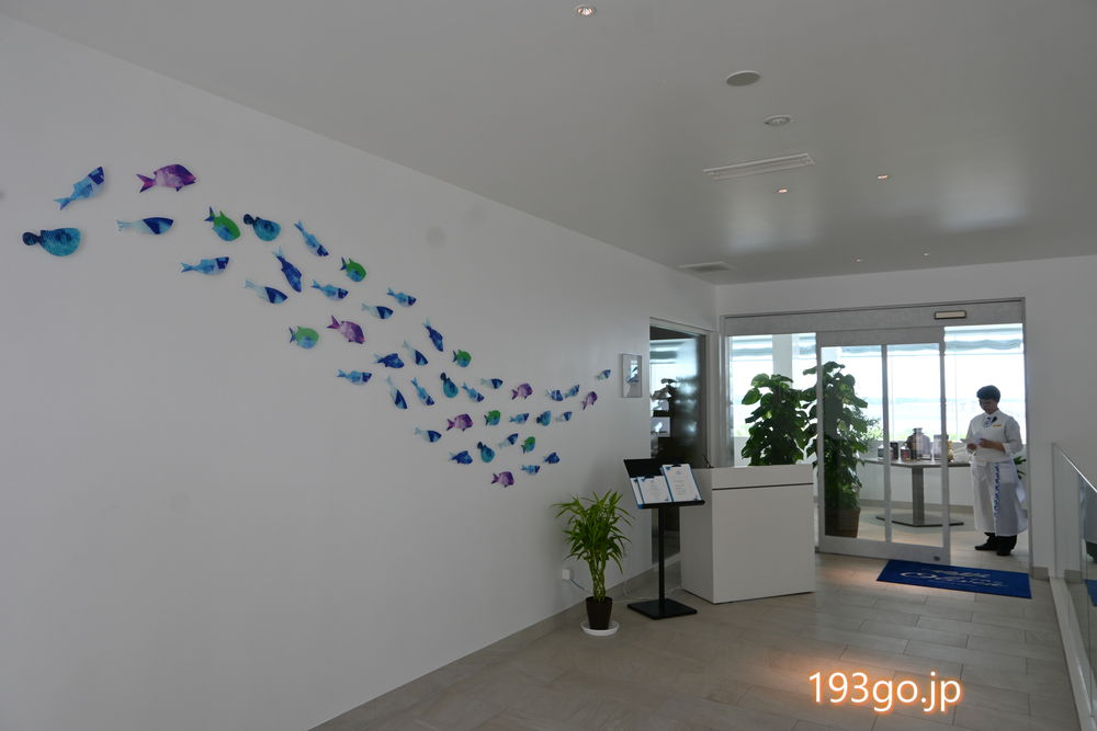 天井や壁のくり抜きの窓から光が差し込む清々しい空間で、ウェルカムドリンクを頂きながらオーシャンビューのチェックイン。