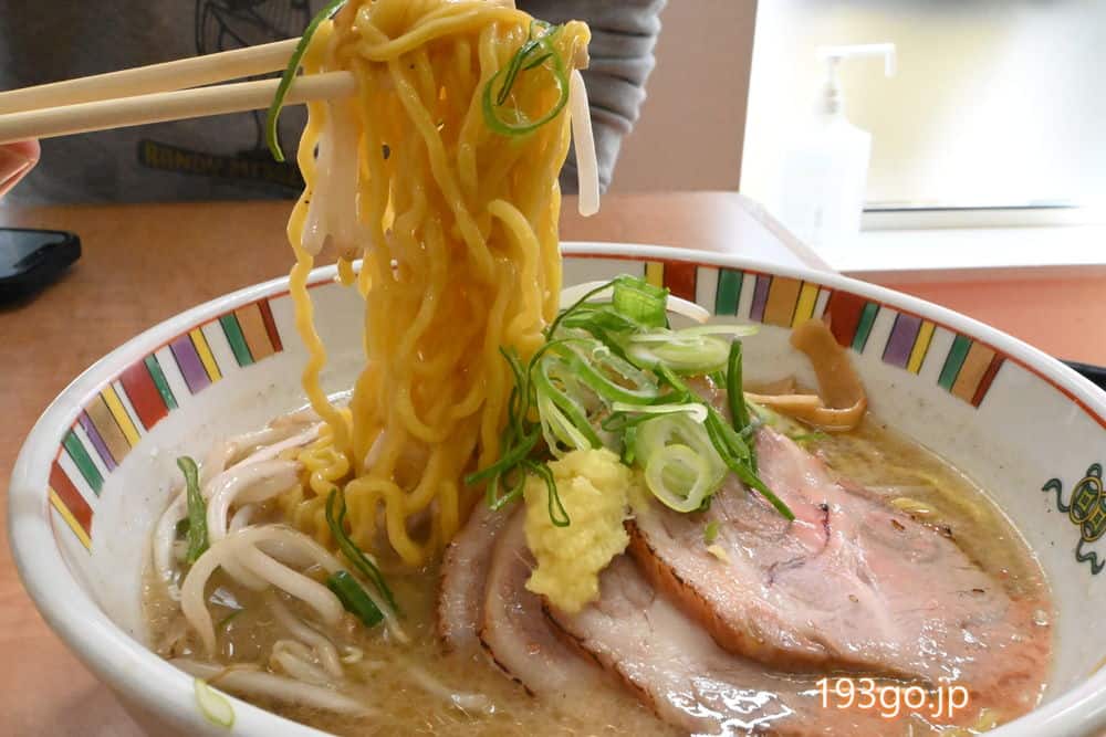 醤油の方は、コクと甘みがあり、ちぢれ麺は硬めの茹で加減。ネギやもやしがシャキシャキ。