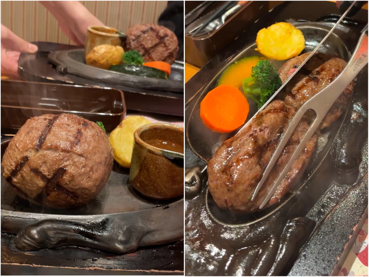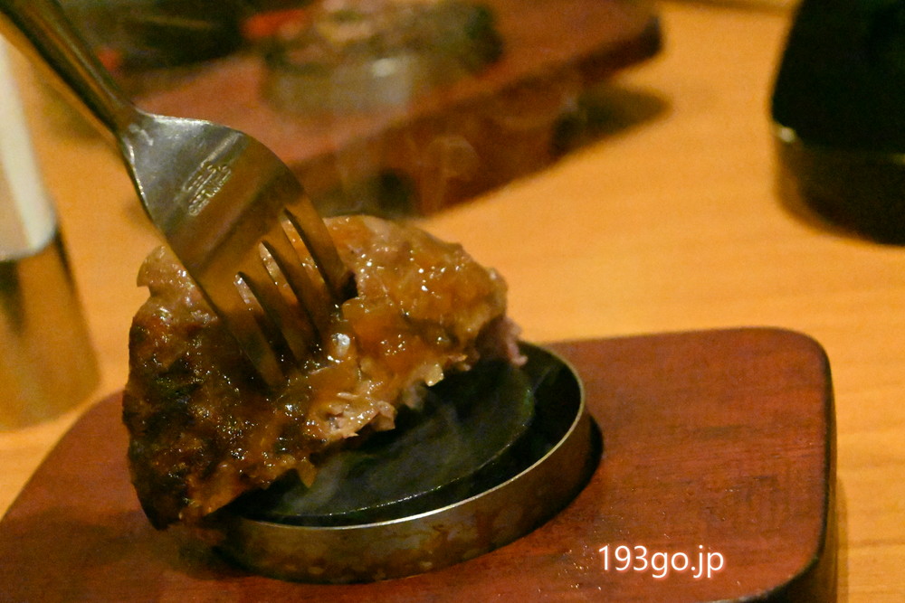 コロンとまん丸のハンバーグを半分にカットし、アツアツの鉄板に断面を押し付け、タレをかけて仕上げられる。