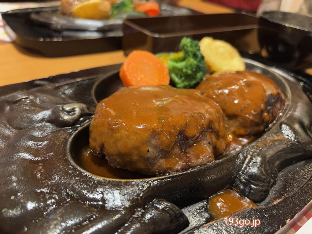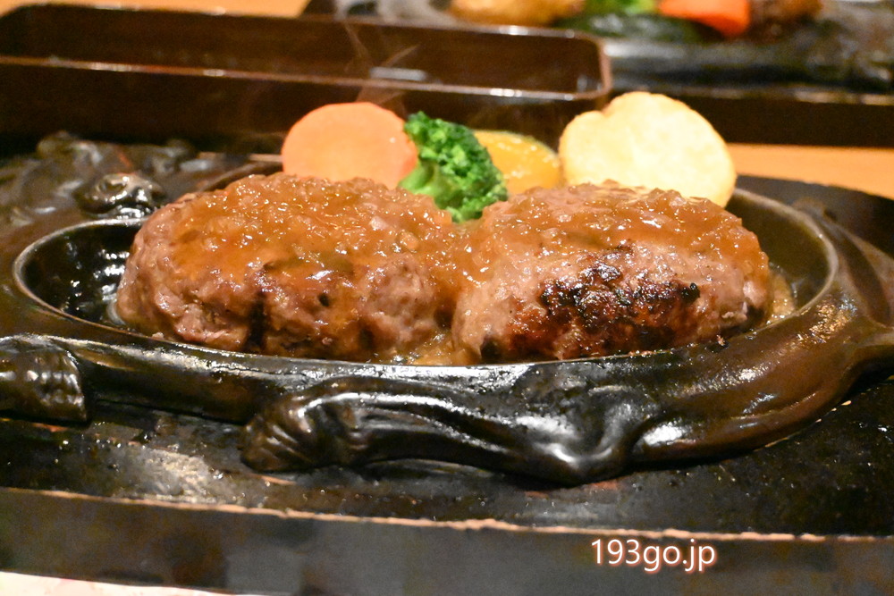 鉄板でジュージュー音を立てて運ばれた牛肉100%のハンバーグ。