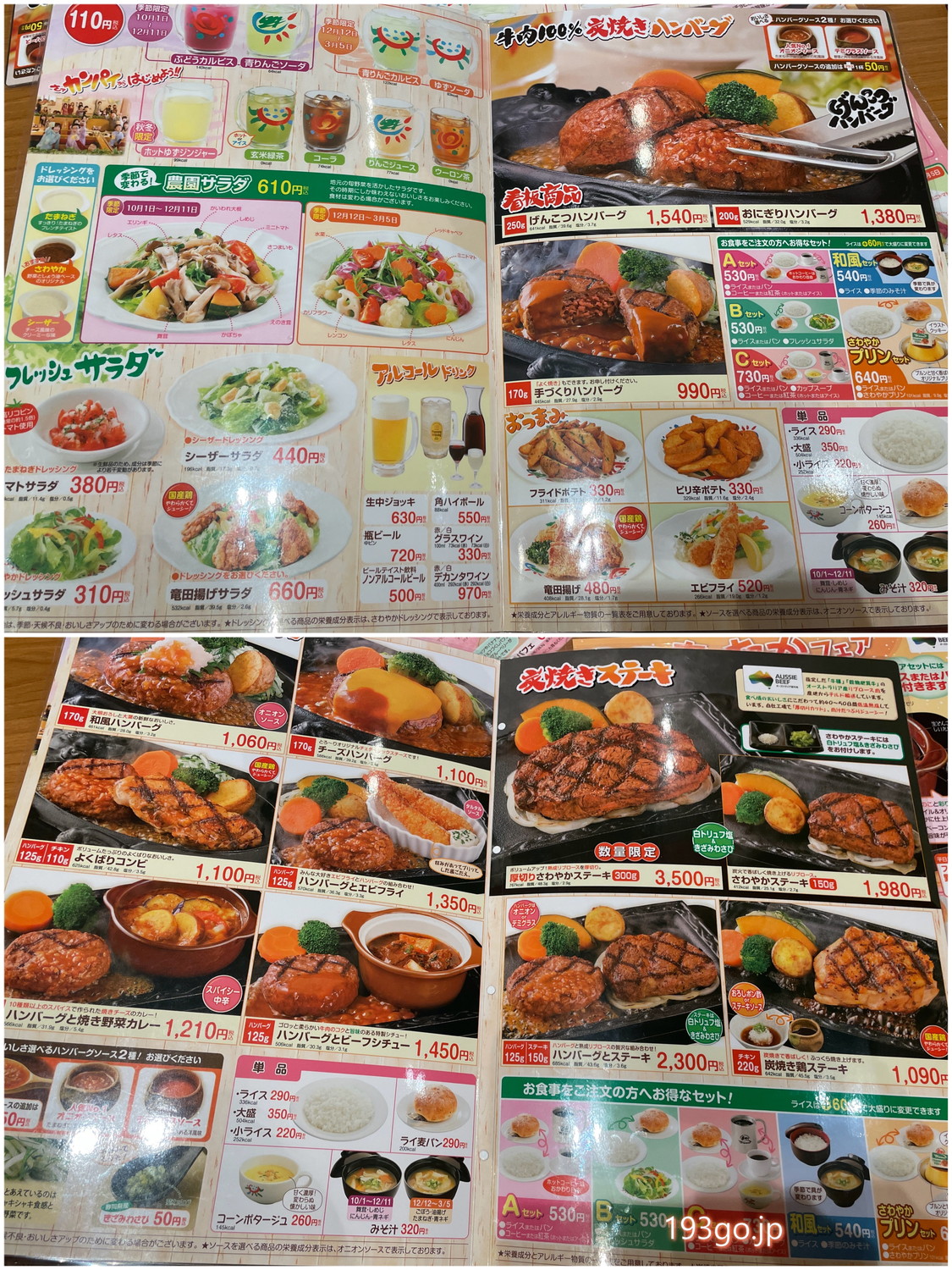 メニューには和風ハンバーグやチーズハンバーグ、エビフライとのセットなど様々な選択肢がある。