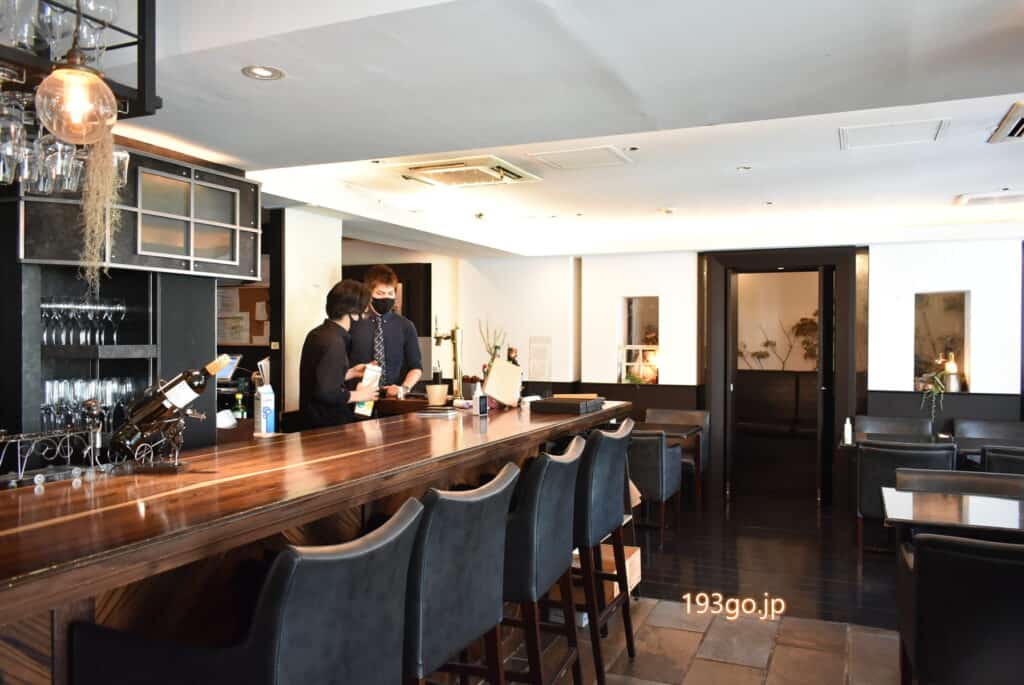 店内に入ると、バーカウンターがあり、奥は広々したテーブル席、半個室になったスペースも。 黒が基調のカッコいい雰囲気。