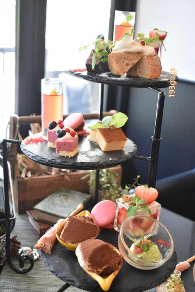 4段のらせん状のアフタヌーンティースタンドに料理が並べられた。