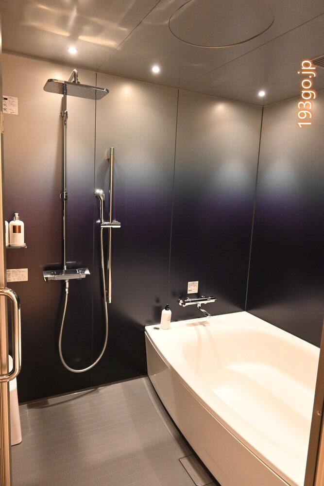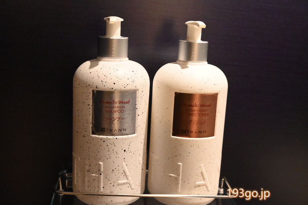 レインシャワーとハンドシャワー付きのゆったりしたバスタブのバスルーム。アメニティはタイのTHANN(タン)も嬉しいね。