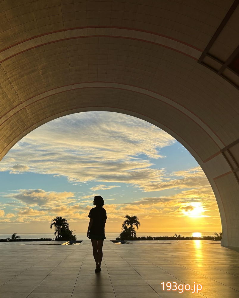 敷地内の駐車場に車を止めホテルに着くと、アーチ型デザインのエントランスから、宮古ブルーの海を見渡す壮大な景色がお出迎え。夕暮れ、夜空と、移り変わる光に包み込まれる。