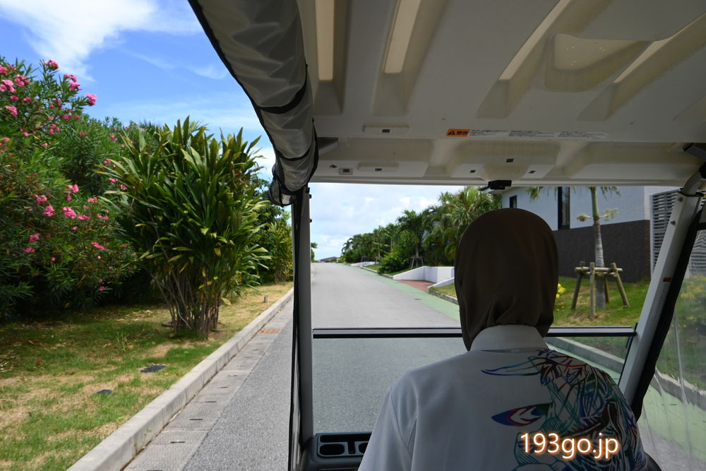 トロピカルジュースのウェルカムドリンクを頂き、チェックインを済ませたら、宿泊棟の「首里ハウス」までカートで向かう。