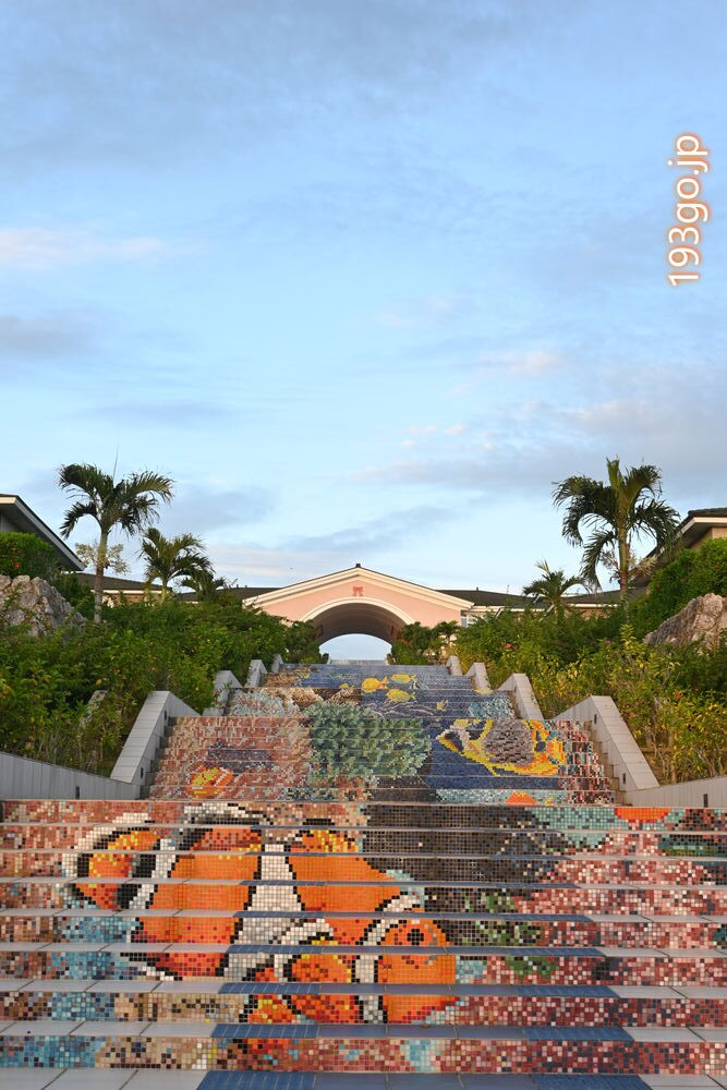 真正面に見える海まで階段で続いてる。両側には客室ビラが立ち並び南国感あふれる。