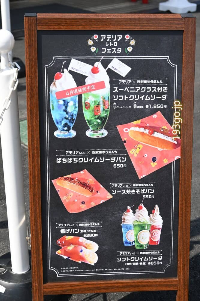 遊園地エリアの「ミルクホール」ではクリームソーダや揚げパン、焼きそばパンなどが販売。店内のイートインスペース、また外のテラス席で飲食可能。