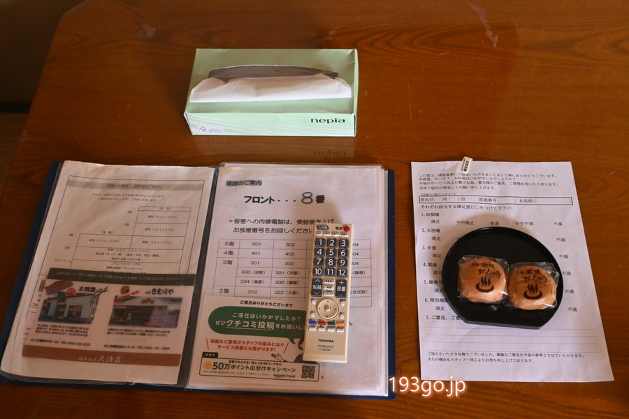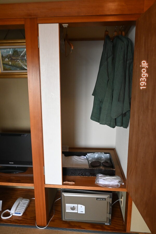 浴衣、館内用スリッパ、温泉まんじゅう、お茶セット、タオル、歯ブラシ、冷蔵庫、冷房、セーフティーボックス完備。洗面所、トイレも備わる。