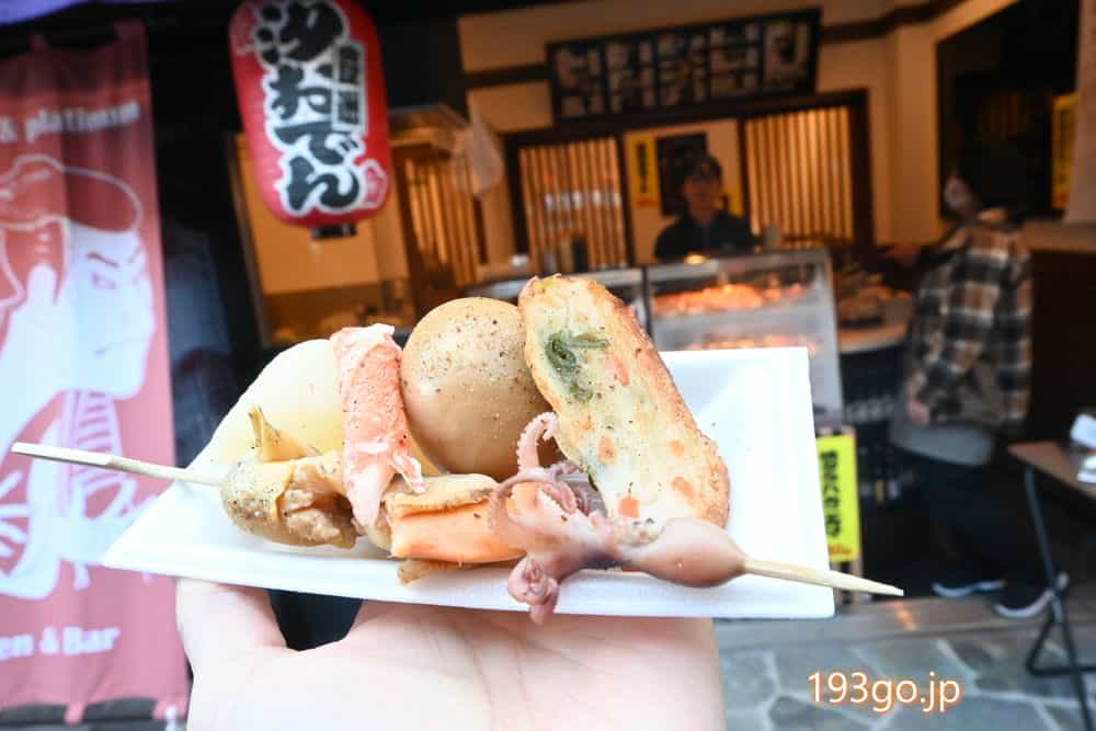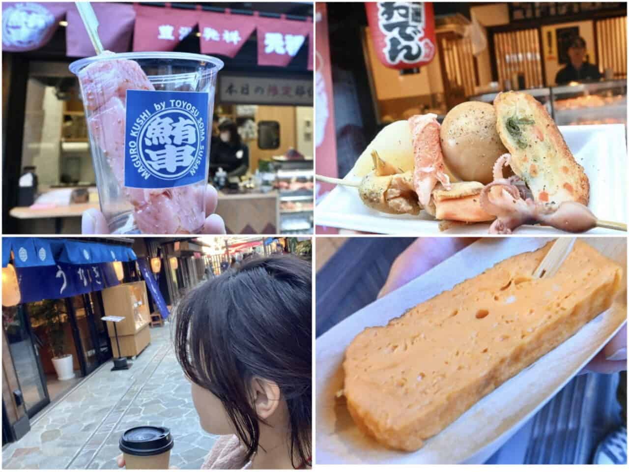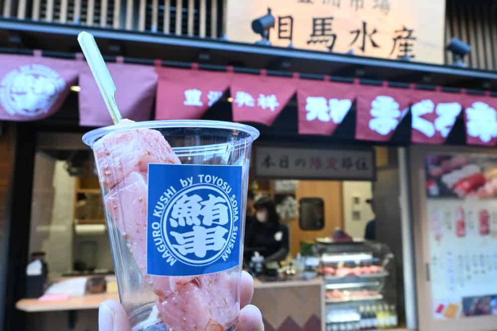 豊洲目抜き大通りで食べ歩き!海鮮づくし&限定グルメ!汐おでん、マグロ串、マグロカツバーガーも