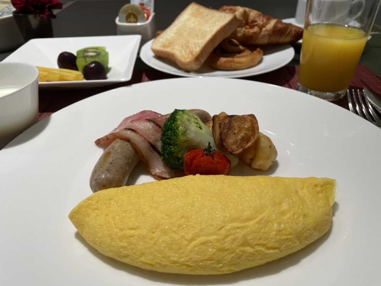 ホテルの朝に食べる理想のフワトロオムレツに、焼きたてのパン。