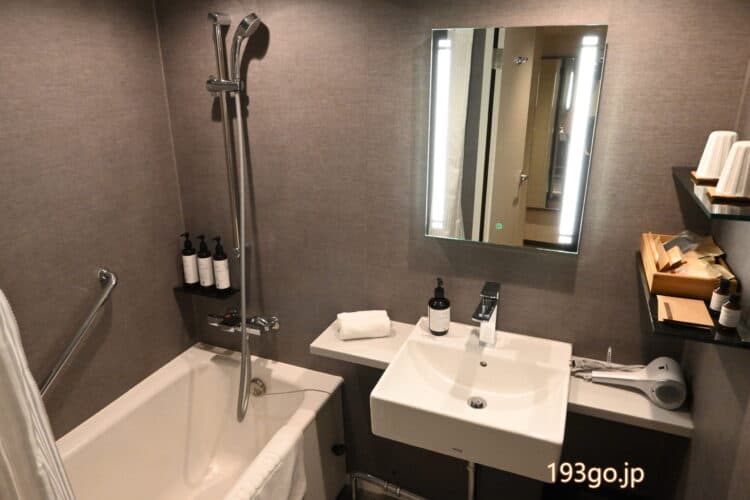 洗い場は無いけど、バストイレ別で、洗面所には、ライトに明るく照らされる女優ミラーが設置。