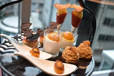 大理石模様や黒を基調とした和モダンな器に盛りつけられたアフタヌーンティーは、柿や栗など秋の食材を使ったプティフィールに、2種のスコーン、セイボリー7種。