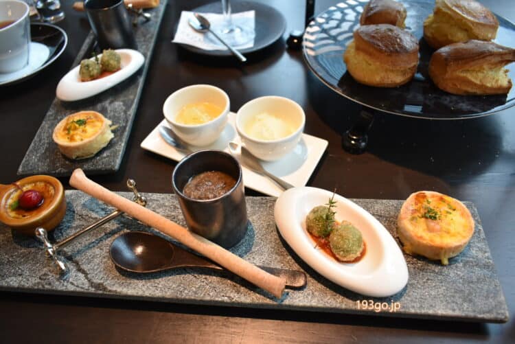 プレートにはフォアグラのブリュレ、銀杏ステッック、キノコのフラン、オリーブのフライ、キッシュなどのセイボリー(惣菜系)。