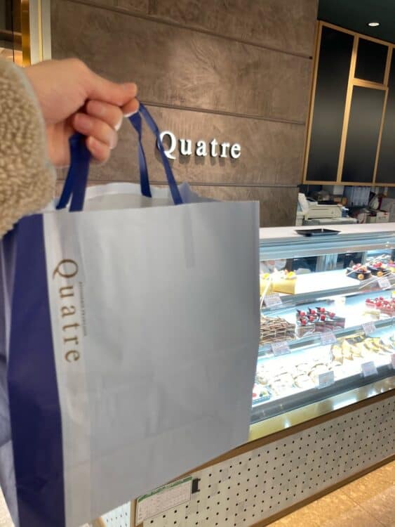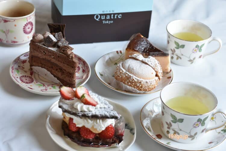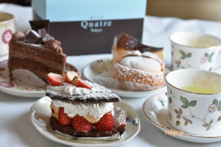 ショーケースに並ぶケーキの数が印象的な「Quatre(キャトル)」で。