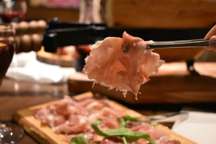 シェフが目の前で削ぎ落とすスライスしたての生ハムはしっとりフワフワ!絶妙な塩気と共にヤミツキ