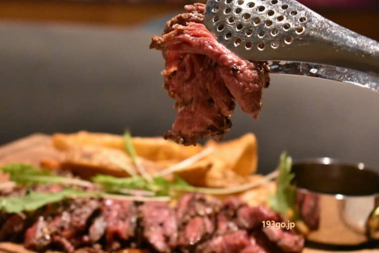 お肉はメキシコ産のハンキングテンダー(牛サガリ)。ブラックペッパーが表面に塗されピリ辛さがアクセントのローストビーフ。細切れで食べやすい。