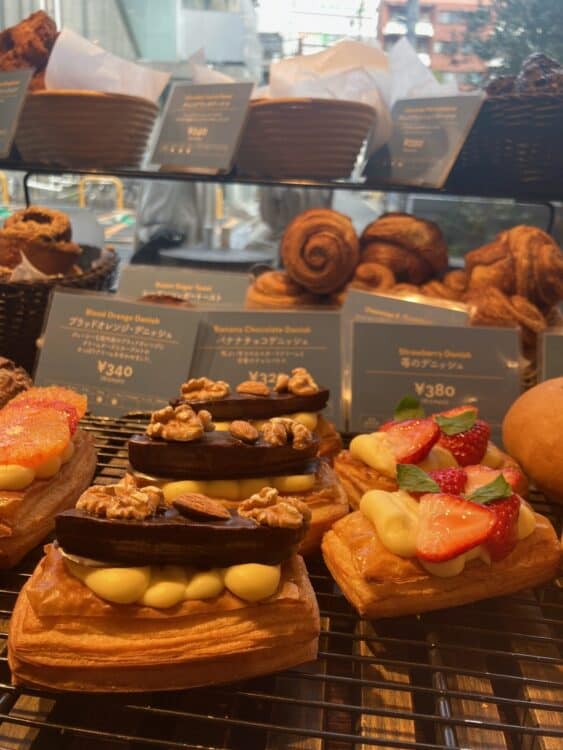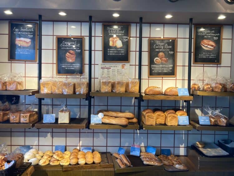中に入ってみるとパン棚にはカレーパン、パンオショコラ、シナモンロール、フルーツやチョコの乗ったデニッシュなど種類豊富なパンが並ぶ。