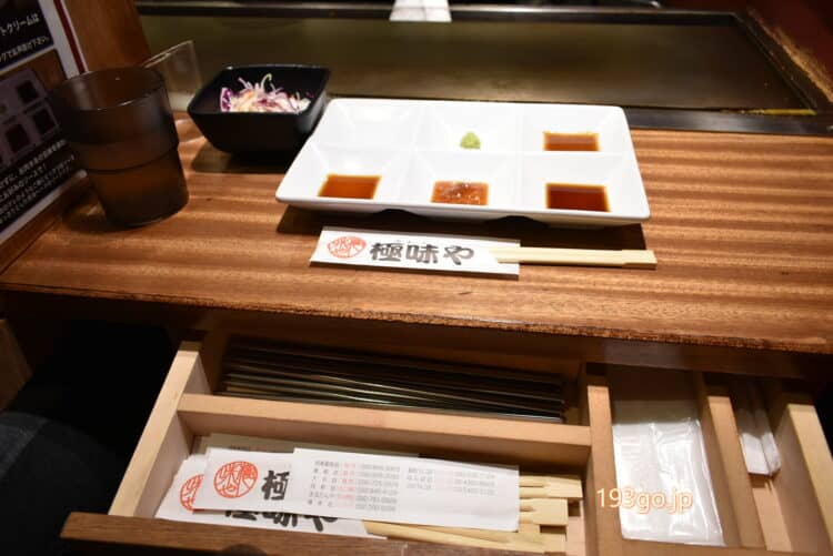 目の前に鉄板、箸やおしぼりは引き出しに。
