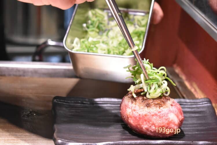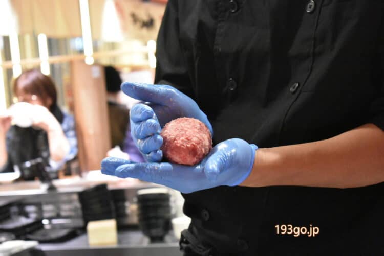 目の前でハンバーグ作り、コロンとした半生状態を鉄板でジュー!6種のソース付き