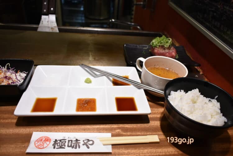 わさびや岩塩、ステーキソースに和風おろしなどの6種のたれを付ければ、これまたご飯も進む!