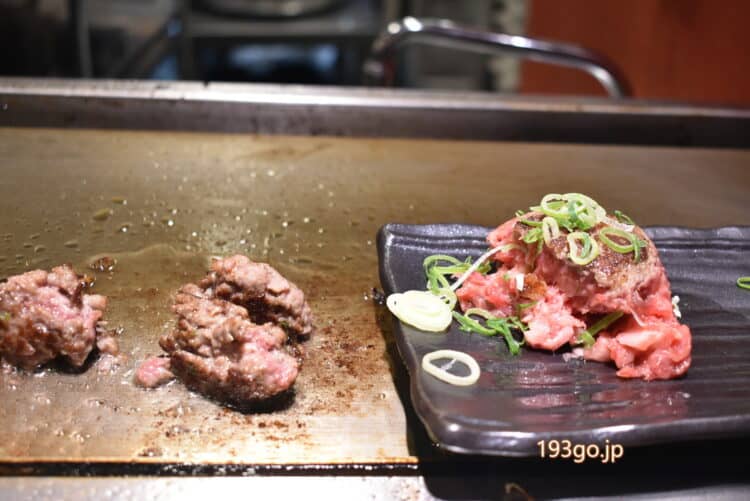ハンバーグをひと口大に切り分け、鉄板の上で焼いて食べる。