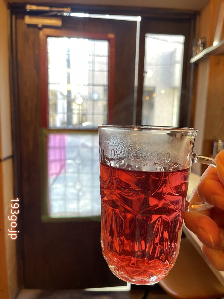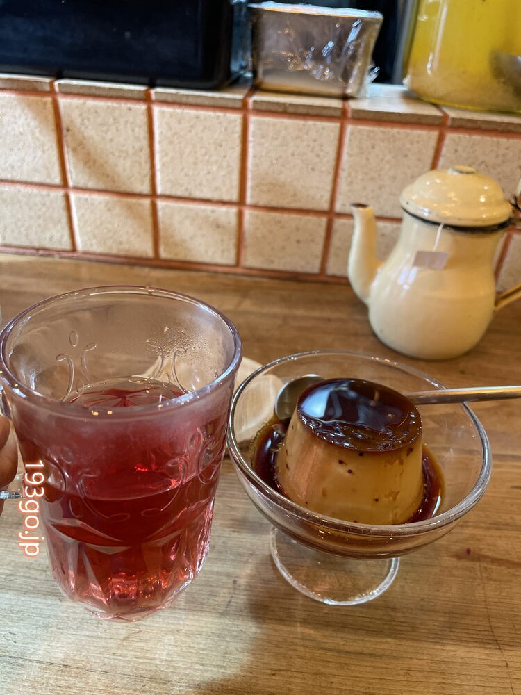 食後にドリンクセット:真っ赤な果物のお茶(HOT)+275円と、プリン+330円を。