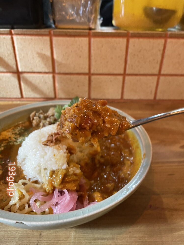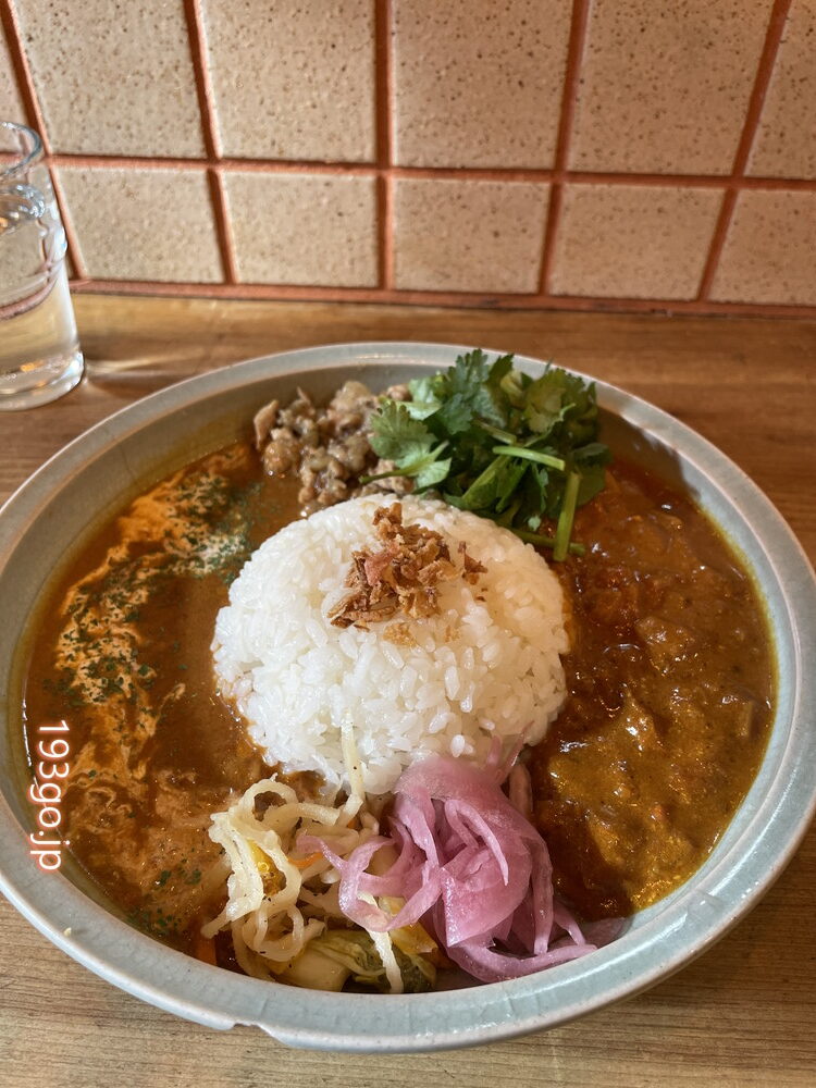 コーン風味の切り干し大根やオニオンピクルスの副菜のサクサク食感も良く、パクチーが香り、大満足の一皿。