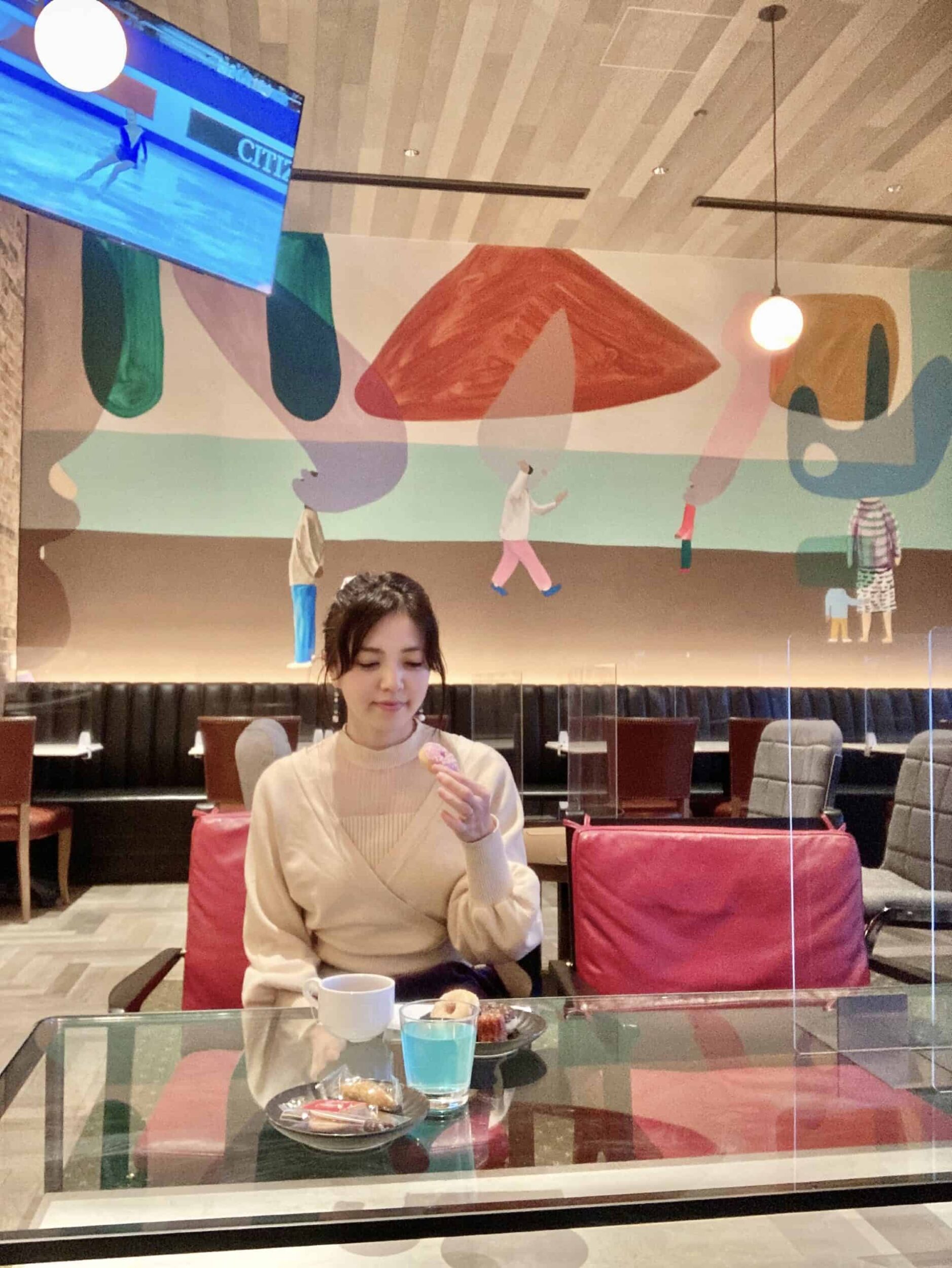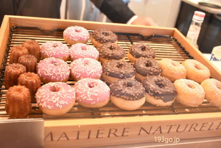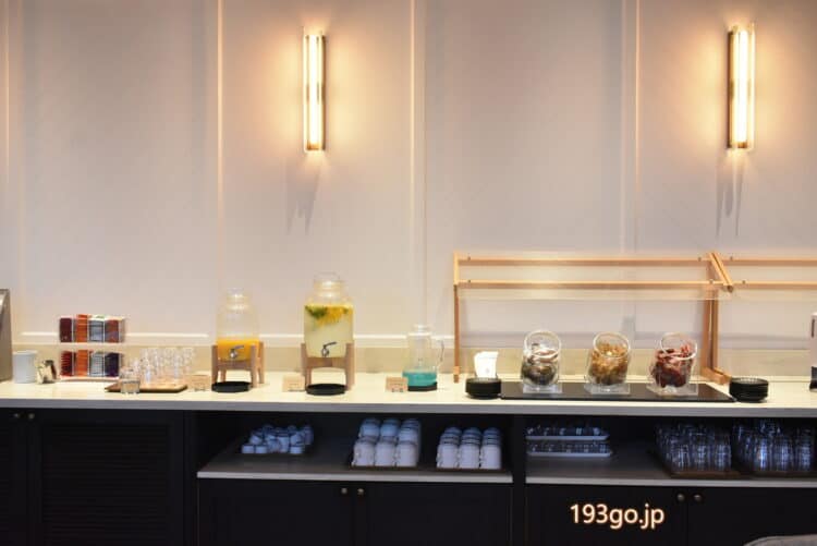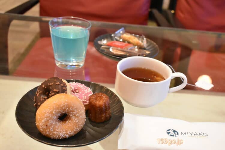 ミニドーナツやカヌレ、ティー、コーヒー、ブランドカラーのブルーを取り入れたオリジナルのレモネードなどが無料サービス。