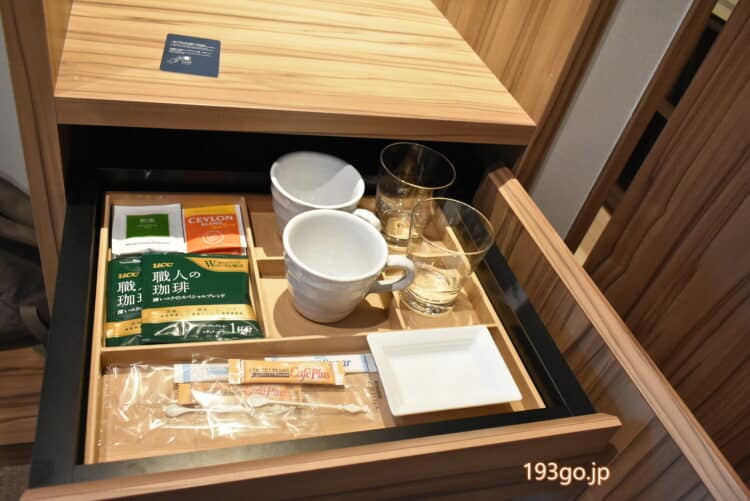 前ボタン式のワンピースパジャマ、お茶&コーヒー、電子ケトル、ペットボトルの水など一通り揃う