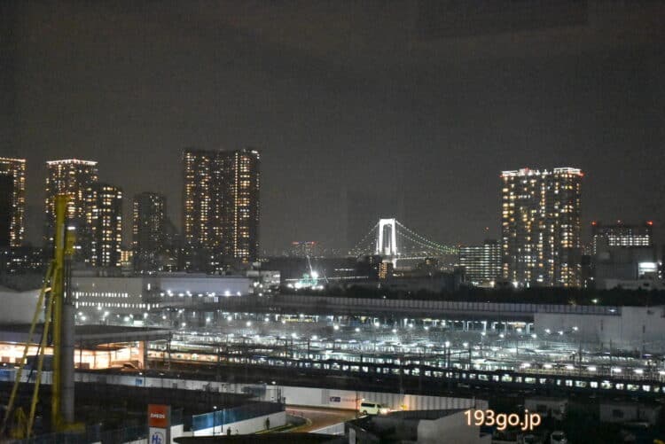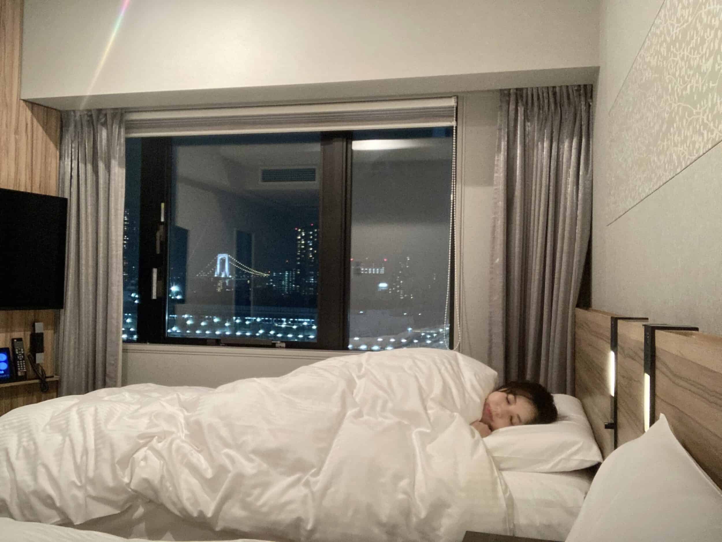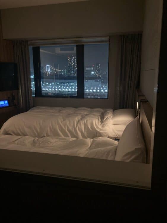 夜になると、窓の外にレインボーブリッジがくっきり浮かび上がり、気持ちが良い布団に包まれ夢心地。
