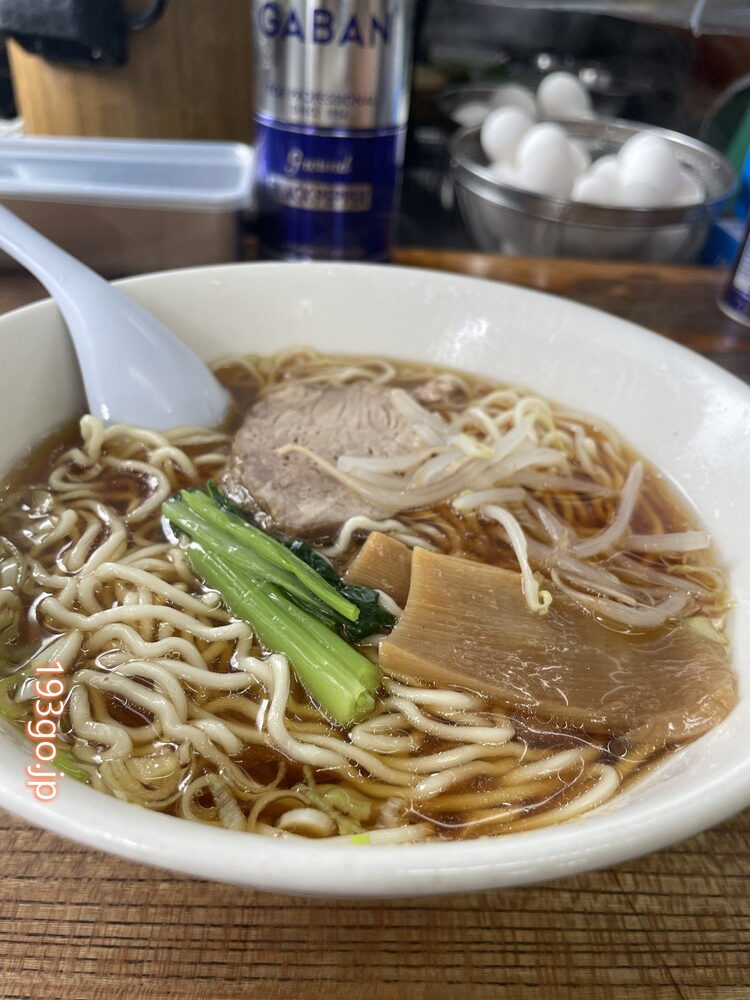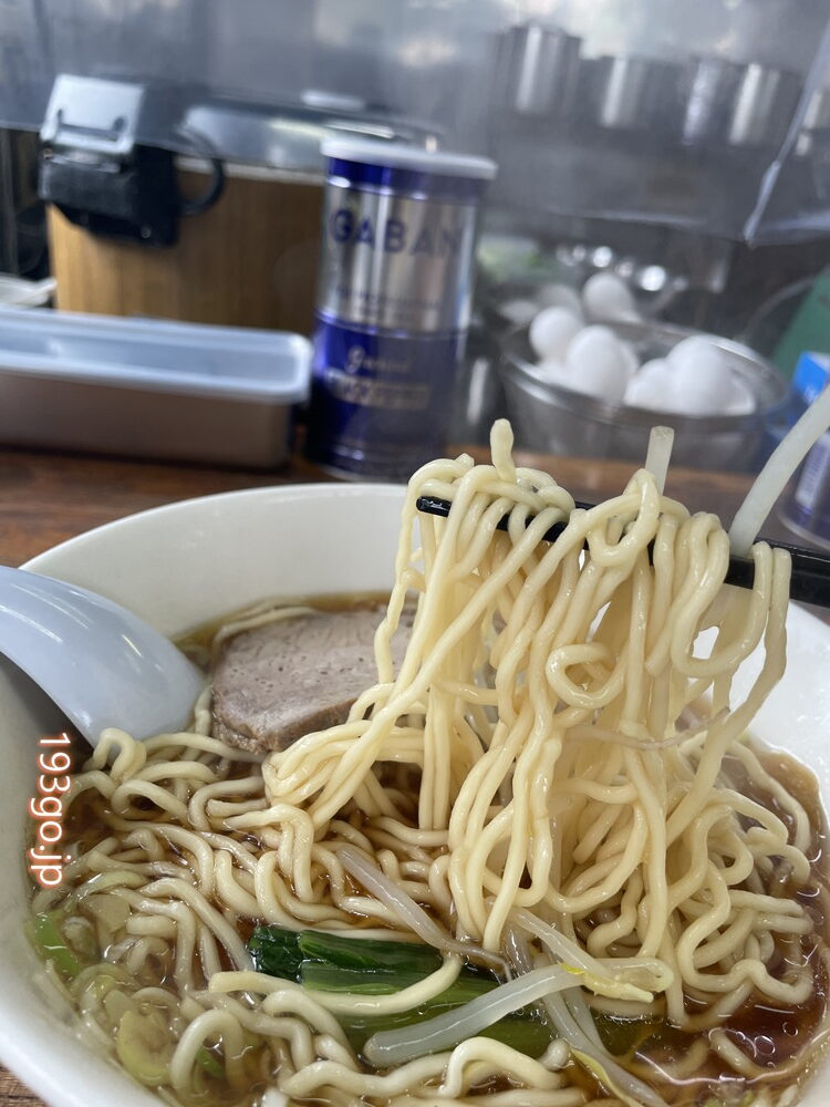 肉の旨味と脂っこさも混ざった塩系スープ。麺は白っぽい丸麺。