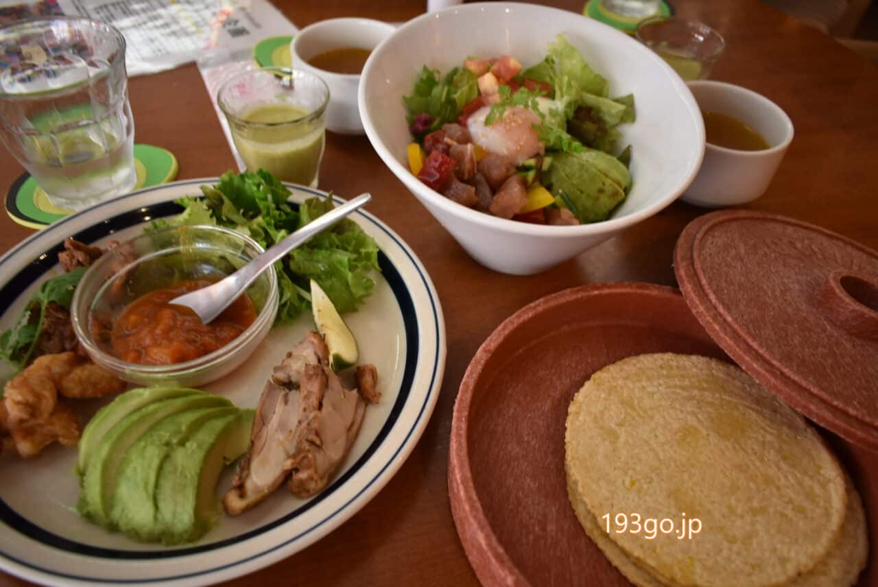 タコスプレートはチキンやアボカド、フリット、レタスなどサルサソースと一緒にトルティーヤに巻いてパクッ!