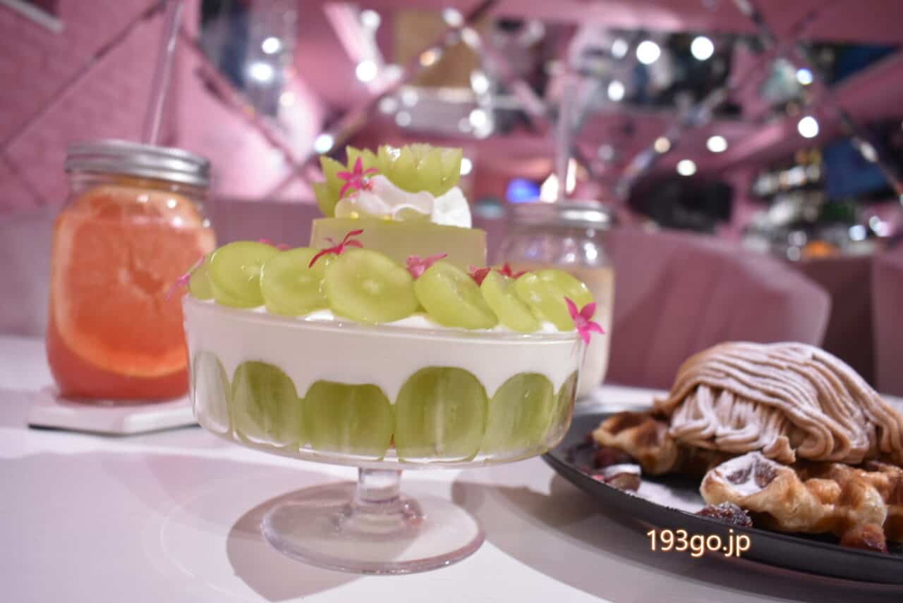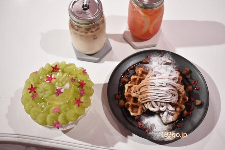 この中から、ドリンクは新宿氷コーヒーをチョイス。モンブランのクロッフルに、豪華な見た目に一目ぼれ、丸ごとシャインマスカットのパフェをいただくことに。